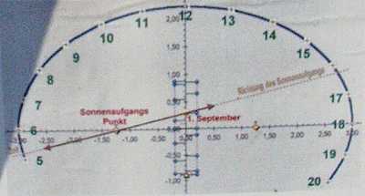 zeigt als Beispiel Richtung und Zeit des Sonnenaufganges am 1. September
